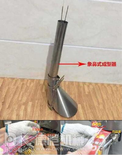 成型器是立柱式顆粒包裝機的關鍵構成部分,要是沒有調整好,制出去的包裝袋子便會不好看,彎曲不兩端對齊等。針對制出去的包裝袋一般碰到的難題便是包裝袋背封(縱封)上下不勻稱或者包裝袋子上下兩側不平衡(以下下圖),導致這種難題的關鍵緣故便是中小型立柱式顆粒包裝機象鼻式成型器沒有調整到規范的情況造成的。一個象鼻式成型器的標準狀況便是,成型器反面是不是在軸線,側邊看成型器的平面度、俯瞰導向性角在橫封封合網上這三個規范。